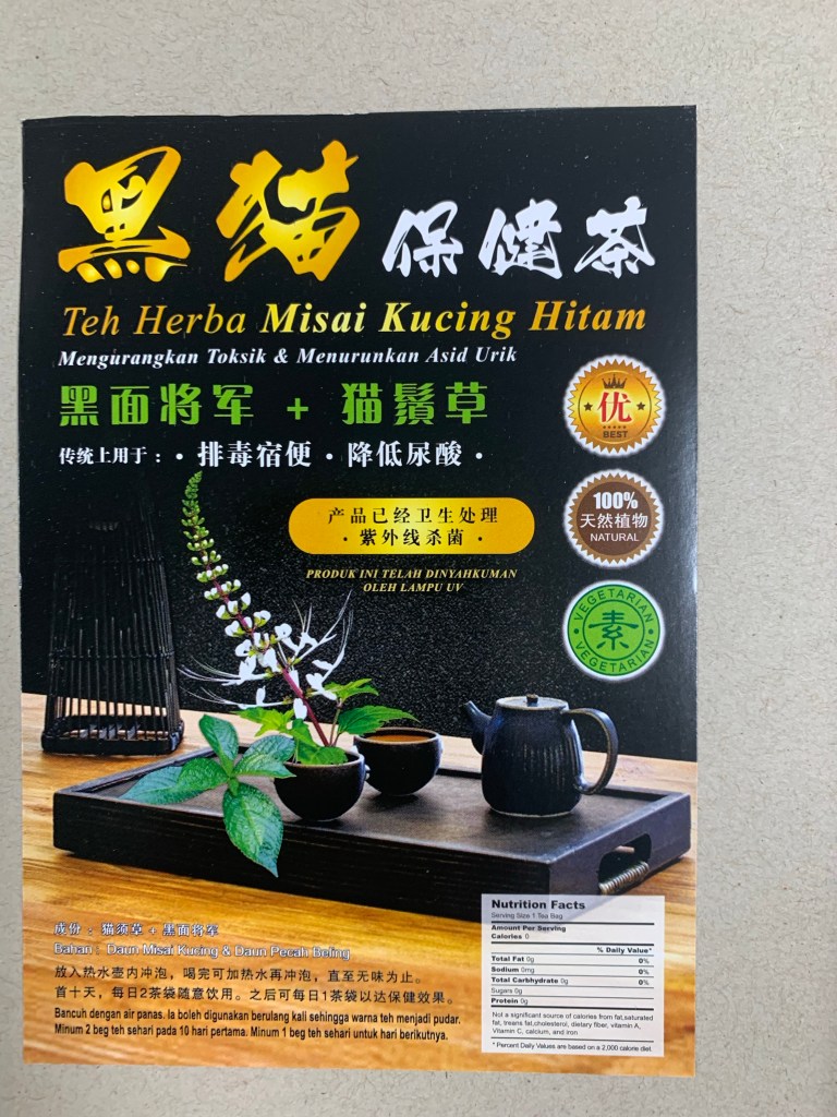 黑猫保健茶:成份,猫须草+黑面将军。功效排毒宿便💩,子宫。肿瘤,尿酸。(温热服用)首十天调理期,一天两袋无时间限制。黑猫保健茶功效:尿酸发作时要用西药治疗先.过后再服用黑猫保健茶把体内毒素尿酸排泄出体外,时不时服用黑猫保健茶。尿酸发作时次数越来越少。后期会永远的斷根。